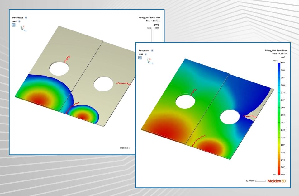 사출 성형은 고정밀 플라스틱 부품을 제조하는 핵심 공정이다. 그러나 성형 과정에서 두 개의 용융 수지 유동 전선이 만나는 지점(그림 1 참조)에서는 웰드라인(weld line)이 형성되기 쉬우며, 이는 제품 강도 저하 및 표면 결함을 초래할 수 있다. Moldex3D 2026은 웰드라인 예측 시스템을 전면적으로 개선하여, 알고리즘 최적화와 사용자 인터페이스 향상을 동시에 구현하였다. 또한 최신 버전에서는 실시간 인터랙티브 파라미터 조정 기능과 동적 계산 분석을 지원한다.
